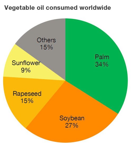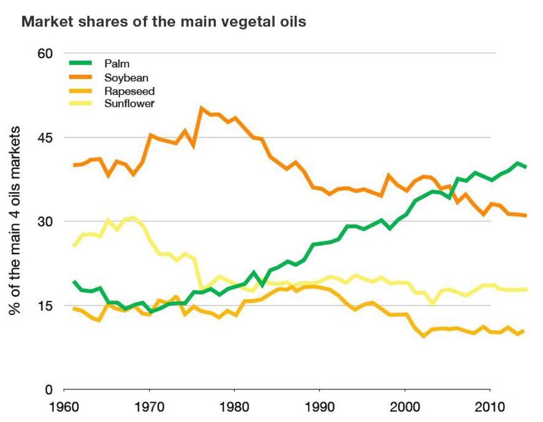 Four major vegetable oils constitute more than 85% of world consumption. Sunflowers, rapeseed, and soybeans were originally grown in temperate countries, but a rising share of soybeans is now produced in Brazil thanks to genetically improved varieties. Oil palms grow only under humid tropical conditions and produce 5 to 8 times more oil per hectare than the other crops.