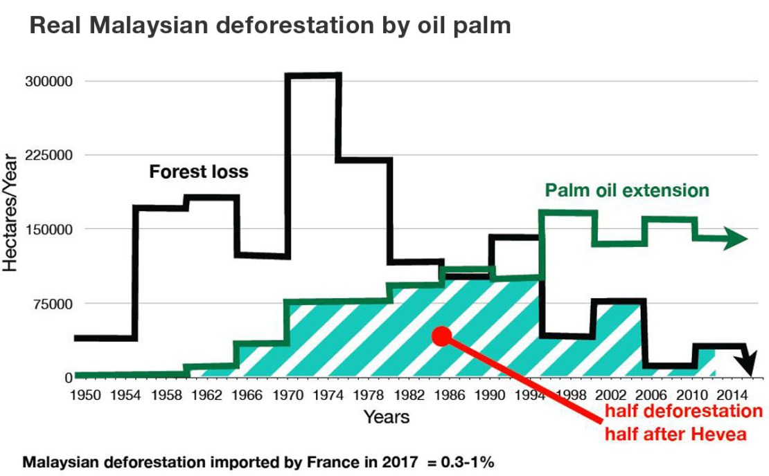Palm plantations are reputed to be a major factor in deforestation. However, despite such widespread perceptions, palm plantations are responsible for only 3% of global deforestation. In Indonesia and Malaysia, deforestation peaked decades ago and was already decreasing before palm oil started to take off. Palm plantations mostly replaced other agricultural uses. For example, in Malaysia, the major phase of deforestation occurred for the development of rubber estates, before the 1980s. Almost all of the rubber plantations were later replaced by palm plantations (figure 10).