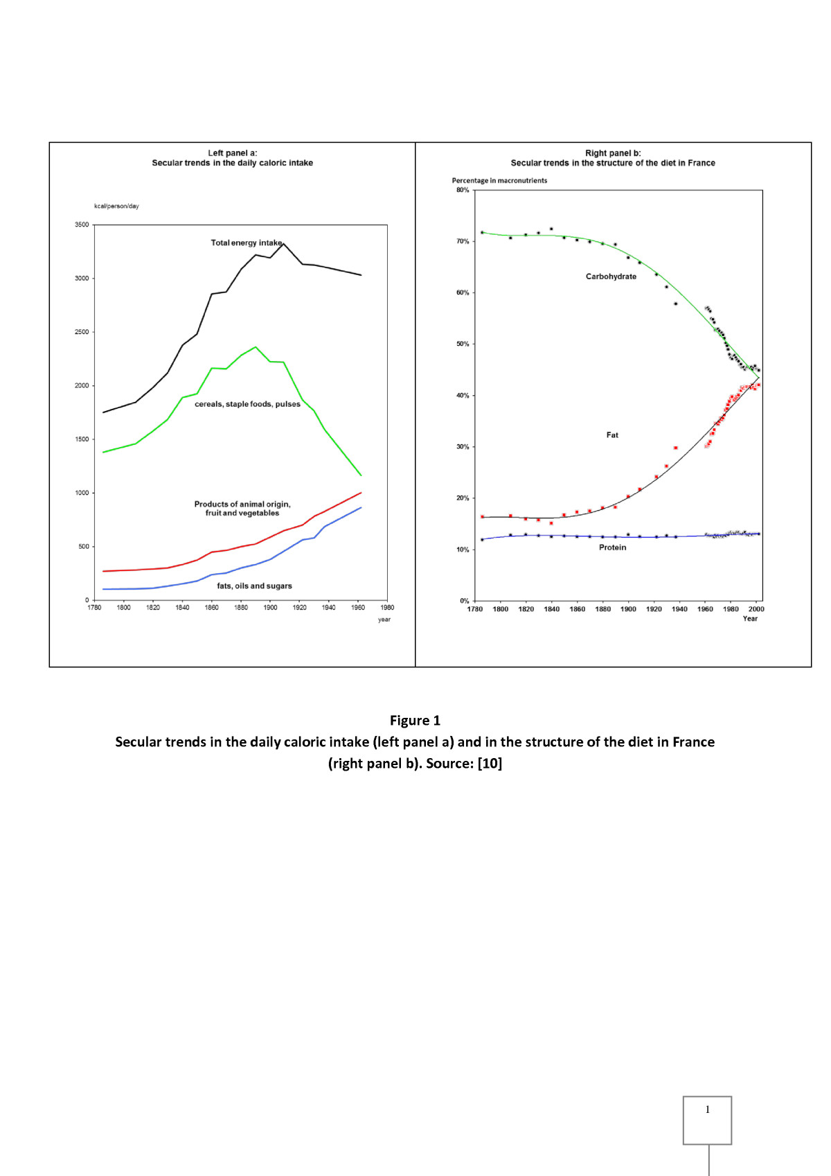 While the total caloric intake in France has leveled off, the proportion of carbohydrates has constantly decreased while that of fats has risen. The two converged between 1980 and 2000. In other words, once the French society provided enough food for all, the average diet progressively increased its share of fats, up to a maximum.