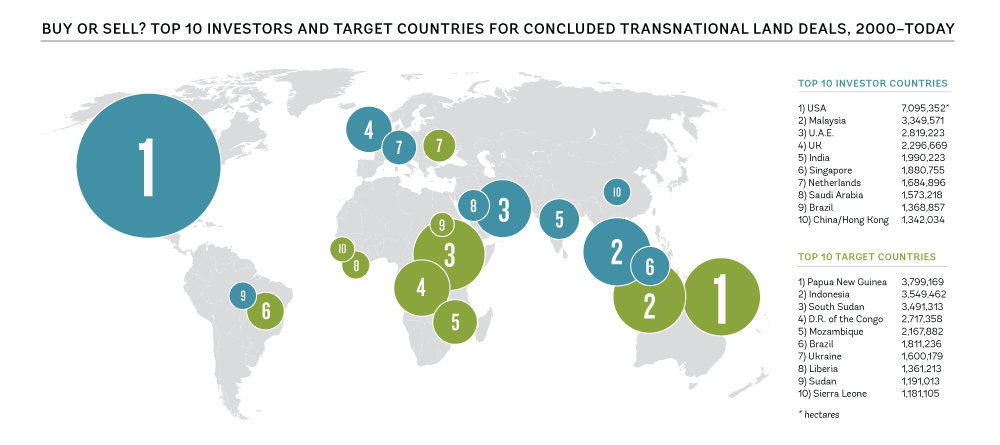 The biggest agribusiness corporations, known as the “ABCDs”, are headquartered in western countries and are highly influential around the world. For example, they allegedly control 75% to 90% of the world grain market. Three of the ABCDs have their headquarters in the United States, which not coincidentally has the largest land bank outside its borders – more than 7 million hectares. Smaller but rising agribusiness corporations from Southeast Asia are also in the competition. As a result, Malaysia has the second-largest land bank, with more than 3 million hectares.